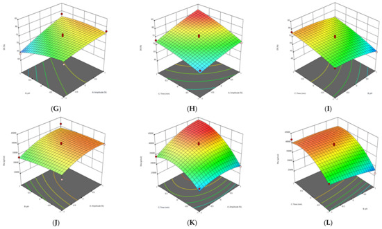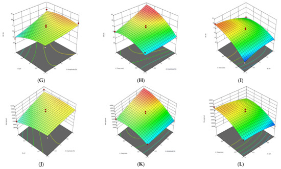 3D graphs showing the influence of extraction parameters on the yield (A–C), GalA content (D–F), DE (G–I) and Mw (J–L) for FN pectin extracted by PUAE.