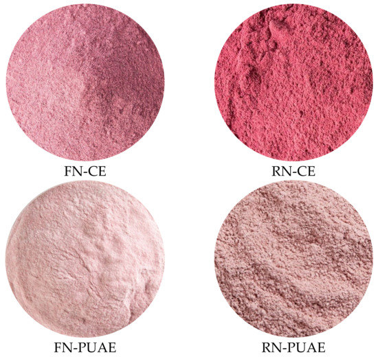 Images of pectin samples extracted from Fetească Neagră (FN) and Rară Neagră (RN) grape pomace by conventional extraction (CE) and pulsed ultrasound-assisted extraction (PUAE).