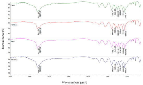 To investigate the different structural characteristics of pectin extracted from grape pomace (FN and RN) by utilizing conventional and pulsed ultrasound-assisted extraction (CE and PUAE, respectively), FT-IR analysis was applied. The FT-IR spectra of pectin samples obtained by CE and PUAE in the optimal conditions are presented in Figure 6. By comparing the spectra, RN pectin extracted by CE, FN pectin obtained under CE and PUAE had a peak around 3311 cm−1 which was attributed to –OH stretching vibration of the phenolic structures and –H bonded [36], while RN pectin extracted by PUAE had a shift at 3309 cm−1 was belonged to the –OH stretching absorption due to inter- and intramolecular hydrogen bonds [37]. The absorption bands at 3269 cm−1, 3267 cm−1 and 3265 cm−1 indicated a broad stretching of O–H [38]. The FT-IR spectra in the wavenumbers of 1410 and 800 cm−1 are identified to as the ‘fingerprint region’ of carbohydrates, which enables the identification of major chemical groups in different polysaccharides [10,13,39]. Therefore, the absorption peaks at 1402 cm−1, 1400 cm−1 and 1399 cm−1 were ascribed to the –CH bending of –CH2 groups, –COO symmetric stretching and asymmetric and symmetric stretching vibrations of the carboxylate anion in the side of polysaccharide, respectively [40,41]. The bands identified at 1304 cm−1 and 1262 cm−1 belonged to symmetric in–plane bending of –CH3, which suggested the presence of flavonoids and polyphenols [42] and C–O stretching of the ester band [43], respectively. The band at around 1210 cm−1 corresponded to C–O and C–C vibration bands of glycosidic bonds and pyranoid rings which are associated with the presence of GalA in pectin structure [41]. Other peaks appeared in the region of 1131 cm−1 and 1065 cm−1 which could be due to C–O–C and C–O vibration stretching in ethers or related compounds [44]. The obtained data showed that CE and PUAE had no significant influence on the main chain of pectin and could have an effect on the side chain of grape pomace pectin (FN and RN). Similar results for the pectin degradation were reported by Chen et al. [45], Ogutu and Mu [46] and Zhang et al. [47].
