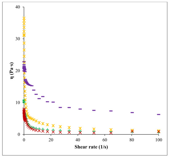 Flow curves of pectin solutions: FN pectin extracted by CE (+), RN pectin extracted by CE (ж), FN pectin extracted by PUAE (×) and RN pectin extracted by PUAE (─); —dynamic viscosity, —shear rate.