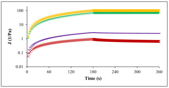 Creep and recovery test of pectin solutions: FN pectin extracted by CE (+), RN pectin extracted by CE (ж), FN pectin extracted by PUAE (×) and RN pectin extracted by PUAE (─); —compliance.