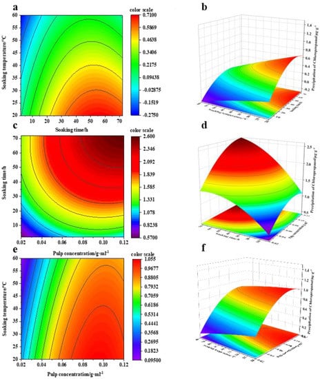 Three-dimensional response surface and contour lines between the dissolved amount of chloropropanol and the two factors. (a) The interactive effect of temperature and time, (b) 3D representation of (a), (c) Interaction of soaking time and pulp concentration, (d) 3D representation of (c), (e) Interaction of soaking temperature and pulp consistency, (f) 3D representation of (e).