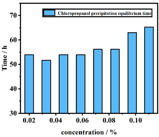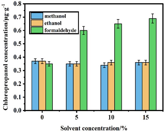 In this study, the effects of adding methanol, ethanol and formaldehyde to the aqueous solution were investigated in terms of the amount of chloropropanol leached from the pulp. The experimental results are displayed in Figure 6. The amount of chloropropanol leached from the aqueous methanol and ethanol solutions with different concentrations remains virtually unchanged, and the concentration of chloropropanol remains constant at 0.36 μg/g, which is almost similar to the amount of chloropropanol leached from the aqueous solution (0.37 μg/g). However, the concentrations of chloropropanol leached from formaldehyde solutions of different concentrations are considerably different. When the concentration of formaldehyde is less than 15%, the leaching amount of chloropropanol increases significantly with an increasing formaldehyde concentration. The concentration of chloropropanol is significantly higher than that of chloropropanol leached from the aqueous solution (up to 0.69 μg/g). Chloropropanol molecules are adsorbed onto the pulp by physical adsorption. The driving force for adsorption stems from intermolecular hydrogen bonds. Formaldehyde can react with the surface of cellulose and the hydroxyl groups in chloropropanol. Thus, the sites on cellulose combined with chloropropanol are passivated, thereby reducing the adsorbed amount of chloropropanol on the surface of cellulose and increasing the number of free chloropropanol molecules in the solution. Thus, the dissolution of chloropropanol is increased []. Therefore, formaldehyde significantly affects the amount of chloropropanol leached from the pulp.