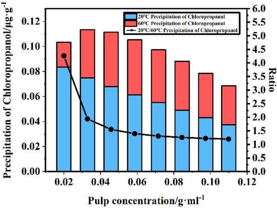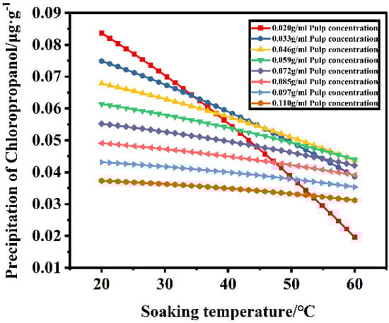 Figure 1e,f indicate that, when the pulp concentration and soaking temperature interact and when the soaking temperature is constant, the leaching amount of chloropropanol increases with an increasing pulp concentration, as shown in Figure 3. When the pulp concentration is constant, the leaching amount of chloropropanol in the pulp decreases with an increasing temperature. For a constant pulp concentration, the leaching amount of chloropropanol in the pulp decreases with an increasing temperature. Figure 4 indicates that, with an increasing temperature, the leaching amount of chloropropanol in the pulp decreases. In the range of 20–60 °C, the highest leaching amount of chloropropanol is obtained at 20 °C, whereas the lowest amount is obtained at 60 °C, which is consistent with the results reported in previous studies. It is possible that part of 3-McPd volatilizes with the increase in temperature, leading to the decrease in extraction efficiency []. It is also probably due to the possibility that 3-MCPD and 1,3-DCP do not just undergo a simple hydrolysis, but possibly either react with a component of the paper sample by an unknown mechanism or are adsorbed or retained by the fibers []). The pulp concentration and the soaking temperature affecting the leaching of chloropropanol are also different (Figure 5). The leaching of chloropropanol is affected to a greater extent by the temperature at lower pulp concentrations than at higher pulp concentrations. Figure 5 is obtained by comparing the leaching amount of chloropropanol at 20 °C with that at 60 °C for the same pulp concentration. Moreover, it can be observed that, when the pulp concentration is lower than 0.06 g/mL, the effect of temperature is significant. However, the effect is weakened with an increasing pulp concentration. At a pulp concentration of 0.06 g/mL, the temperature does not substantially affect the leaching of chlorohydrin. When the pulp concentration is further increased, the effect of temperature in the range of 20–60 °C on the leaching amount of chlorohydrin is not apparent; this finding is consistent with that of previous studies. Therefore, cold water extraction is considered as the most effective method to extract chloropropanol [], and the effect of temperature on the leaching of chloropropanol is more significant under the condition of lower pulp concentrations.