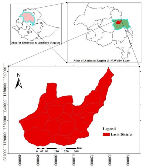 The research was carried out in the Lasta District, North Wollo Zone, Amhara Regional State of Northeastern Ethiopia (Figure 1). Lasta is one of the 166 districts in the Amhara Region, with a total of 23 Kebeles and a total population of 119,482, out of which 60,038 are males and 59,444 are females [13]. The district’s population is largely dependent on mixed agriculture, with an average land tenure of 0.5–0.65 hectares per farmer household. According to the Lasta District Agricultural Office [14], Lasta is one of the region’s food-insecure and drought-prone districts. Lasta is bordered to the north by the Gazigibla District (Waghimera Zone), to the south by the Meket District, to the east by the Gidan District and to the west by the Bugna District [14].