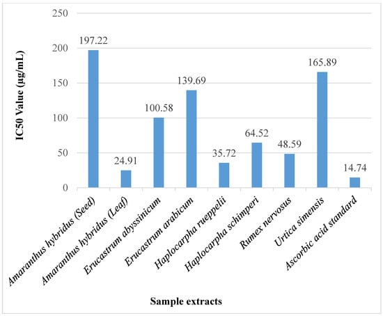 The top seven WEPs identified in the study area [16] with their edible parts (grains and leaves of Amaranthus hybridus, young shoots of Rumex nervosus and leaves of the other five species such as Erucastrum arabicum, Erucastrum abyssinicum, Haplocarpha rueppelii, Haplocarpha scimperii and Urtica simensis) were collected from different localities of the Lasta District in the morning hours of October 2020 where the edible parts are diversely available. The edible parts of each species were collected from three and more individuals, and the composite sample was taken for analysis. The collected samples were cleaned with distilled water, dried under the shade and stored in the Debre Tabor University Biology Laboratory under freezing conditions. The powdered samples were stored in dark brown umber bottles before being sent to the Addis Ababa University Food Science and Nutrition Center for antioxidant activity and anti-nutritional factors analysis.