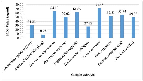 The IC50 value of WEP extracts in the FRAP assay was calculated to determine the extent of extracts needed to reduce 50% of ferric ions, and the result is presented in Figure 3. At the lower concentrations, the reducing potential of A. hybridus leaf extract is the best to reduce 50% of the ferric ion with low concentration (8.22 µg/mL), followed by H. schimperi leaf extract (27.32 µg/mL). The least IC50 value was recorded in the R. nervosus young shoot extracts (71.48 µg/mL).