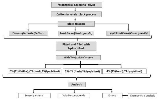 - Sánchez, R.; Martín-Tornero, E.; Lozano, J.; Arroyo, P.; Meléndez, F.; Martín-Vertedor, D. Evaluation of the olfactory pattern of black olives stuffed with flavored hydrocolloids. LWT 2022, 163, 113556. [Google Scholar] [CrossRef]