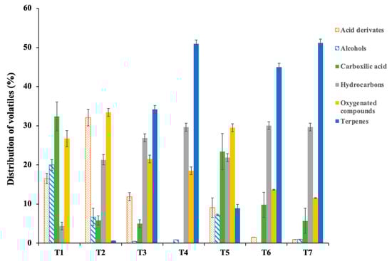 | Volatile Compounds | RT (min) | T1 | T2 | T3 | T4 | T5 | T6 | T7 |