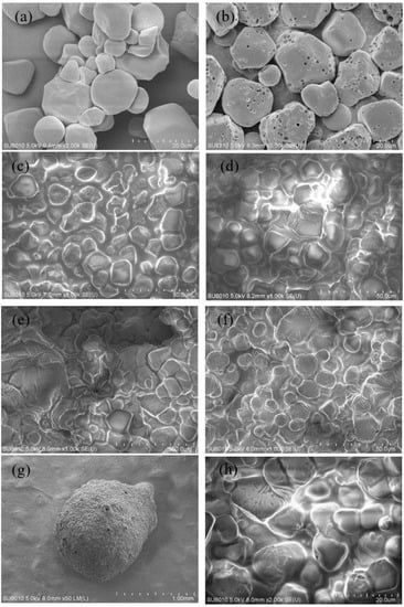 The morphology of the natural starch and modified porous starch were observed under 2000 magnification (Figure 2a,b). The natural starch (Figure 2a) was an irregular granule with a smooth surface. The modified starch (Figure 2b) had not significantly changed in shape but had an irregular appearance overall. Moreover, the surface had become rough, and a large number of microporous structures appeared (Figure 2g and Figure S3). This is very similar to the modified starch prepared using enzymatic digestion by other results. Both had many microporous structures on their surfaces [].