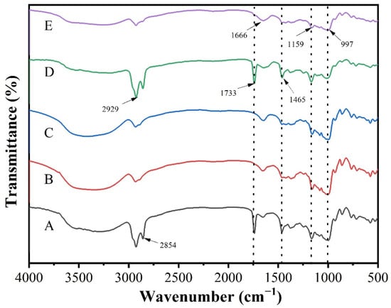 FTIR spectra of (A) PS/SOEO; (B) modified starch; (C) natural starch; (D) SOEO microcapsules; and (E) microcapsules without SOEO.