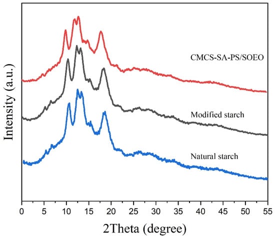 XRD pattern of natural starch; modified starch; and CMCS-SA-PS/EO.