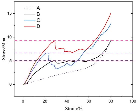 The pressure resistance of SOEO microcapsules (Groups A, B, C, and D) was analyzed by a universal mechanical testing machine (CMT6103). The range of the load sensor was 10 kN, and the test speed was 1.5 mm/min. The compression deformation was obtained by displacement of the crosshead of the testing machine, so the compression elastic modulus calculated in this study is the apparent elastic modulus. Each sample was conducted in triplicate.