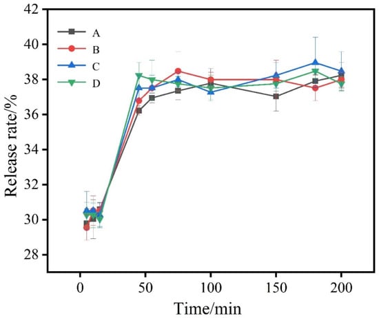 Figure 6 shows the release of sweet orange essential oil microcapsules in 50% anhydrous ethanol. In the range of 0–200 min, the release curves generally conformed to the mathematical model of y = a × b []. After fitting the C capsules by the origin, the resulting release kinetic equation was y = 3.6108 × 1.7226 with a well-fitted correlation coefficient of R2 = 0.9716. It can be seen from the graph that SOEO in the four groups was released rapidly in the anhydrous ethanol solution during the period of 0–50 min; after 50 min, the release rate of the four groups of sweet orange essential oil microcapsules tended to stabilize. It can be speculated that some essential oils may have been attached to the surface of the microcapsules at the beginning and when entering the ethanol solution, these surface oils were released into the ethanol solution in a shorter period of time, thus resulting in a faster release rate at the initial stage [,].