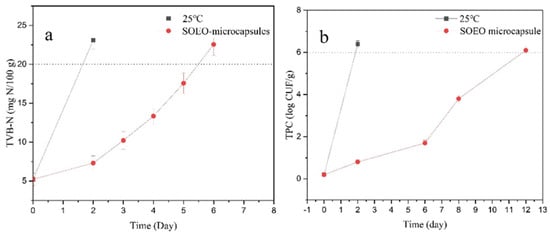 The TVB-N (a) and TPC (b) of crawfish under 25 °C and SOEO microcapsules.