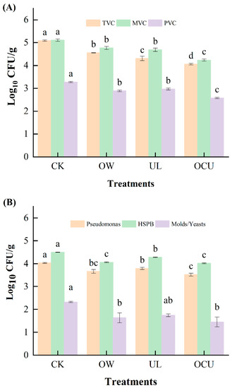 Panels (A,B) show the microbial count of crayfish washed by different treatments; mean values are expressed as log CFU/g. Error bars were derived from standard deviation of means. The significant differences (p < 0.05) between treatments for the same index are expressed alphabetically (a, b, c, and d). Notes: CK, the control; OW, ozone water cleaning; UL, ultrasound cleaning; OCU, ozone water combined with ultrasound cleaning; TVC: total viable count; MVC: mesophilic viable count; PVC: psychrophilic viable count; HSPB, hydrogen sulfide-producing bacteria.