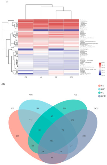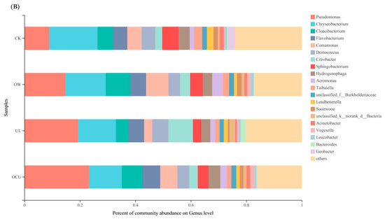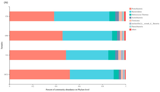 Most OTU in crayfish belonged to five bacteria phyla, including Proteobacteria, Bacteroidetes, Deinococcus-Thermus, Actinobacteria, and Firmicutes. Bacteroidetes, Actinobacteria, and Firmicutes were reduced to varying degrees by ozone water, ultrasound, and the union of both (Figure 2A). Compared with the control, the Proteobacteria from three treatments increased markedly. Deinococcus-Thermus from both OW and OCU was also significantly decreased (4.23 and 4.27%, respectively) compared with the control (5.05%), while UL (5.90%) was increased. These phyla include Proteobacteria, Bacteroidetes, Actinobacteria, and Firmicutes, which usually appear alone or in combination in the microbiota of crayfish and shrimp [41,42,43,44,45]. In fact, Proteobacteria, Firmicutes, Actinobacteria, and Bacteroidetes were also dominant phyla in other food samples and meat processing rooms [37,38,46].