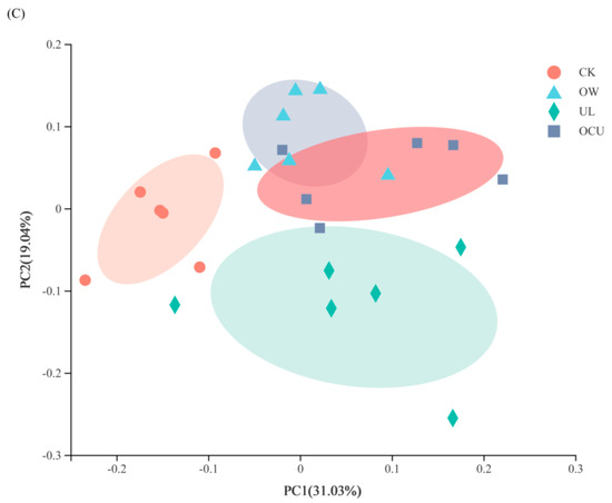 Compared with CK (8.96%), the relative abundance of Pseudomonas in treatments increased. Concretely, the abundance in OW, UL, and OCU were 14.83, 19.41, and 23.22%, respectively. Generally, Pseudomonas was considered to be the dominant microbiota in crayfish [45,60]. However, because the total microbial load was unknown, although the relative abundance of Pseudomonas increased, it was not known whether this phenomenon was due to an increase in its absolute quantity or a decrease in the abundance of other microbiota. This phenomenon has occurred in other species. Staphylococcus counted by microbial plate was not affected by ozone treatment, but its relative abundance was decreased by high-throughput sequencing [38]. Taking Geobacter as an example, its detected level was extremely low (<1%) after ozone water or ultrasound cleaning compared with the control (2.59%), which indirectly increased the relative abundance of Pseudomonas. Another fact referred to the “other” category: the relative abundance of CK, OW, UL, and OCU were 24.03, 17.14, 20.23, and 15.93%, respectively, which indicated that some less abundant and unclassified genera in the “others” category were more sensitive to ozone water and ultrasound treatment.
