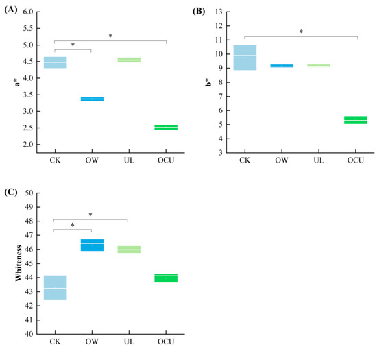 Panels (A–C) were respectively a* value, b* value, and whiteness, and expressed as boxplots. Compared with the control, the significant difference was expressed as * (p < 0.05). Notes: CK, the control; OW, ozone water cleaning; UL, ultrasound cleaning; OCU, ozone water combined with ultrasound cleaning.