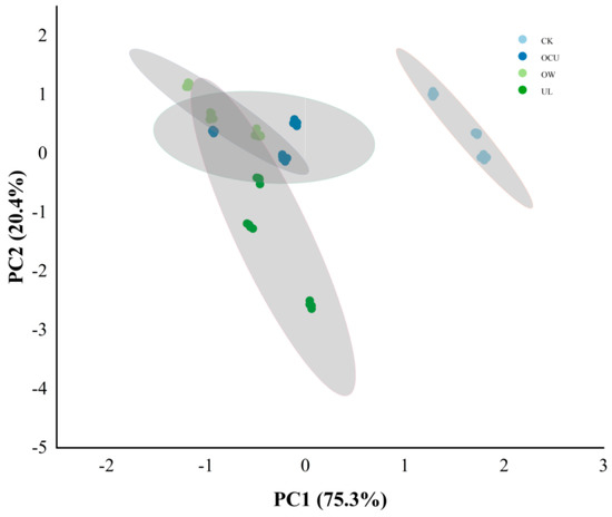 Crayfish odor clustering based on principal component analysis. Notes: CK, the control; OW, ozone water cleaning; UL, ultrasound cleaning; OCU, ozone water combined with ultrasound cleaning.