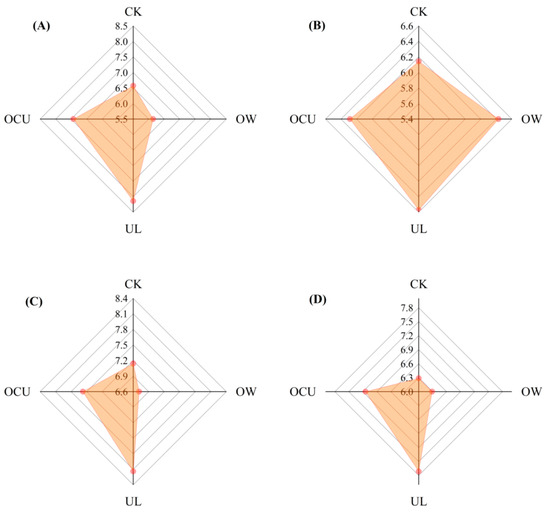Panels (A–D) were respectively color, texture, odor, and overall evaluation of crayfish samples, and expressed by radar map. Notes: CK, the control; OW, ozone water cleaning; UL, ultrasound cleaning; OCU, ozone water combined with ultrasound cleaning.