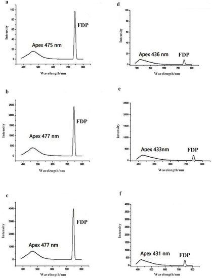The fluorescence measurements were conducted with three brands of fluorescence spectrophotometers including a Hitachi F-4500 (Tokyo, Japan), a Shimadzu RF-5301PC (Shimadzu, Japan) and a Shanghai Lingguang F97 (Shanghai, China), which were all equipped with a plotter unit and a 1 cm quartz cell. The fluorescence of each sample solution was directly measured with an excitation wavelength of 370 nm and an emission range from 385 to 800 nm. The scanning speed was 12,000 nm/min, and spectrometer slits were set for a 5 nm band-pass. Fluorescence measurements of each sample were carried out in triplicate. The pattern of fluorescence spectra and the FDP intensity of all samples were recorded at room temperature.