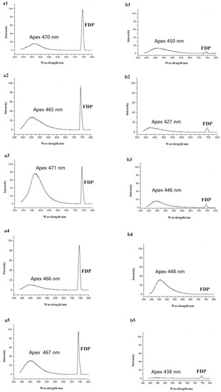 Typical fluorescence spectra of honey and syrup ((a1): acacia honey; (a2): chaste honey; (a3): medlar honey; (a4): rape honey; (a5): linden honey; (b1): maltose syrup; (b2): HFCS; (b3): rice syrup; (b4): beet syrup; (b5): cassava syrup).