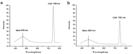 Commonly, the addition of 30% or higher syrup can make substantial profits. In this study, the minimum amount of syrup added was 10%, and compared with the honey sample, there was a significant difference (p < 0.01) (Table 2). We also found that a small deviation in the apex wavelength could be used as an auxiliary qualitative indicator for the relative purity of a given honey sample. Specifically, the apex wavelength shifted from 470 nm to 460 nm, and the FDP intensity decreased from 990 to 610 with the dilution of acacia honey to 30% syrup (Figure 3).