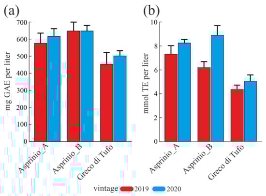 Polyphenolic compounds influence the organoleptic characteristics of wines. In light of this, the total polyphenolic content (TPC) of the three white wines analysed for 2019 and 2020 vintages was estimated by using the Folin-Ciocalteu assay and TPC values are reported in Figure 1a. TPC was higher in the 2020 vintage compared to 2019 for both ‘Geco di Tufo’ and ‘Asprinio_A’ wines, while it is similar for ‘Asprinio_B’ wines for both vintages. In particular, the average TPC value of ‘Asprinio_B’ wine was higher than those of ‘Asprinio_A’ and ‘Greco di Tufo’ wines (647.72 mg/L, 596.88 mg/L and 477.45 mg/L, respectively).