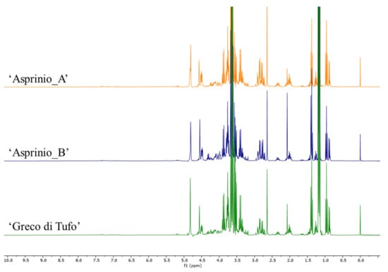 1H NMR spectra of 3 representative samples of ‘Asprinio_A’, ‘Asprinio_B’ and ‘Greco di Tufo’.