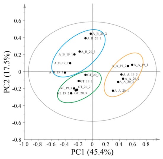 Score scatter plot of PC1 versus PC2 obtained from the PCA of NMR data. The ellipse represents the Hotelling T2 with 95% confidence. A_A = ‘Asprinio_A’; A_B = ‘Asprinio_B’; GT = ‘Greco di Tufo’. The vintage is indicated by the numbers 19 (for 2019) and 20 (for 2020).