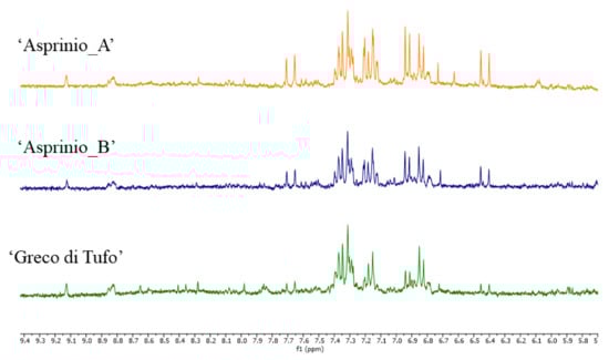 1H NMR spectra of 3 representative samples of ‘Asprinio_A’, ‘Asprinio_B’ and ‘Greco di Tufo’, details of the aromatic region.