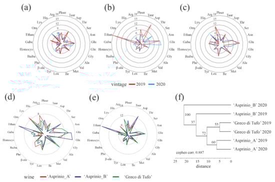 In (a–c), radar graph representing the free amino acid profile changes (percentage) in ‘Asprinio_A’, ‘Asprinio_B’ and ‘Greco di Tufo’, respectively, analysed in 2019 and 2020 vintages. In (d,e), radar graph representing the free amino acid profile changes of ‘Asprinio_A’, ‘Asprinio_B’ and ‘Greco di Tufo’, respectively, in 2019 or 2020 vintages. In (f), dendrogram corresponding to the cluster analysis of free amino acid profiles in ‘Asprinio_A’, ‘Asprinio_B’ and ‘Greco di Tufo’ from 2019 and 2020 vintages. Numbers on the dendrogram are bootstrap values (% of 1000 replicates).