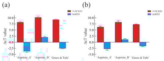 In (a,b), relative quantification of grapevine and yeast DNA in ‘Asprinio_A’, ‘Asprinio_B’ and ‘Greco di Tufo’ samples in 2019 and 2020 vintages, respectively. Data are means of relative quantification measurements based on the ∆Ct Method ± SD; n = 3 biological replicates for each sample.