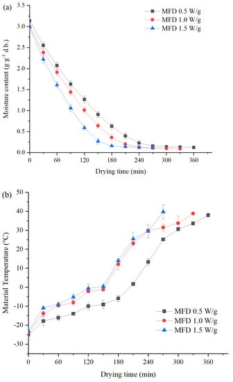 The drying characteristics of yam slices by MFD under different microwave power density levels are shown in Figure 1. It took 360, 330, and 270 min for MFD at 0.5, 1.0, and 1.5 W/g, respectively. Drying was accelerated by the increasing microwave power density, thus shortening the drying time. Compared to HAD (420 min, data not shown), a higher drying efficiency was obtained by MFD although it was low-temperature sublimation drying. Rapid microwave heating provided energy for the sublimation of ice crystals [17]. As shown in Figure 1b, the material temperature increased continuously in the drying process, with a slow rising in the sublimation drying stage. Poor microwave absorption and conversion ability of materials caused by the low dielectric constant and loss factor at low temperature is the reason [18]. When the material temperature was greater than 0 °C, its ability to absorb microwaves was enhanced, which can be proved by the rapid temperature rising (Figure 1b). For MFD at different microwave power densities, the same change trend of material temperature was observed. The slower temperature rise was found in the case of the lower microwave power density, resulting in a longer drying time.