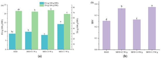 Total starch content, free glucose content, and IBV were determined to estimate the effects of different drying methods on starch in yams (Figure 2). The total starch content of dried yam flours ranged from 67.74 to 74.86 g/100 g dry weight (DW), with the lowest value for MFD 1.5 W/g dried samples. On the contrary, the MFD 1.5 W/g dried samples had the highest free glucose content (14.26 g/100 g DW). More hydrolysis of starch to glucose as affected by microwave action may explain the reason. There was no significant difference in total starch content and free glucose content among MFD 0.5 W/g, MFD 1.0 W/g, and HAD dried samples (p ≥ 0.05). For HAD, a drying temperature of 50 °C favored the hydrolysis of starch to glucose by endogenous α-amylase and glucosidase in plants, as they had the highest enzyme activity at 55–60 °C [19]. However, for MFD, although the material temperature was lower, the starch cleavage was enhanced by microwave.