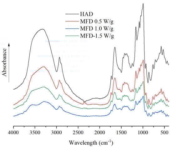 The FTIR spectra provides the information of the main chemical components in the sample. The changes in crystal form, chain conformation, and helical structure of molecular starch will change the infrared absorption. Figure 3 shows the FTIR spectra of Chinese yam flours. All samples presented basically similar FTIR spectra. There was no new functional groups generated, but the position and intensity of the absorption peak were slightly different as affected by drying methods and processing parameters. The bands in the range of 1100–950 cm−1 are considered to a probe band of short-range order of starch. The absorbance at 995 cm−1 is associated with the single-helical crystal structure of starch. The bands at 1047 cm−1 and 1022 cm−1 are related to the short-range ordered structure and amorphous structure of starch, respectively. The ratio of peak intensity at 1047 and 1022 cm−1 (R1047/1022), which indicates the short-range order of starch, was determined (Table 2). The R1047/1022 of dried yam samples treated with HAD, MFD at 0.5 W/g, MFD at 1.0 W/g, and MFD at 1.5 W/g were 0.984, 0.956, 0.963, and 0.969, respectively. A higher R1047/1022 value obtained by HAD samples than that of MFD samples was due to the increased mobility of starch chains in the crystalline region, leading to the formation of a double helix [25]. The increased R1047/1022 value in MFD-treated samples with increasing microwave power density demonstrated the improvement in short-range order, suggesting that the weaker microwave energy radiation increased the degree of damage to the ordered structure due to the longer drying time. Jiang et al. [23] also suggested that dielectric drying could destroy the structure of starch by de-chaining and hydrolysis.