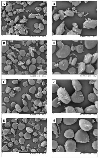 Scanning electron microscopy of yam flours at a magnification of 1000× (A–D) and 2000× (a–d). (A,a) HAD samples; (B,b) MFD 0.5 W/g samples; (C,c) MFD 1.0 W/g samples; (D,d) MFD 1.5 W/g samples.