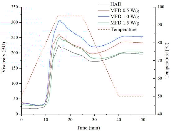 The pasting profiles of starch offer information on the viscosity and thickening behavior, providing a basis for potential industrial applications. Figure 5 shows the pasting profiles of the yam flours dried by HAD and MFD, and similar trends in viscosity changes are observed. All samples had very low viscosity at the beginning of gelatinization because the starch was not soluble in water at low temperatures. As the temperature of the system increased, the hydrogen bonds in the crystalline region of the starch were broken. Starch granules rapidly absorbed a large amount of water and then swelled, causing the suspension to become a viscous starch gel, accompanied by a gradual increase in viscosity [26]. During the holding stage at a high temperature (95 °C), the viscosity of the dispersion gradually decreased under the action of shearing force. In the subsequent cooling process, the re-association of starch molecules occurred, and a three-dimensional network structure formed, with the released amylose combining with water molecules through hydrogen bonds, so the viscosity increased [12].