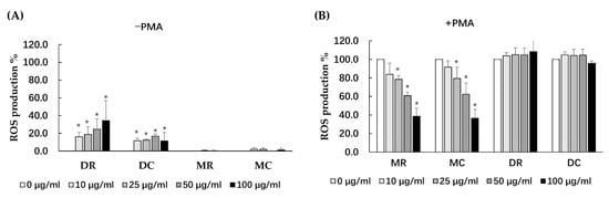 Effects of various extracts of glutinous purple rice on ROS production in peripheral blood mononuclear cells under conditions of: (A) an absence of PMA (−PMA), and (B) the presence of PMA (+PMA). Accordingly, *: significantly different than the negative control, p < 0.05. MR: methanol extract of raw rice, MC: methanol extract of cooked rice, DR: dichloromethane extract of raw rice and DC: dichloromethane extract of cooked rice.