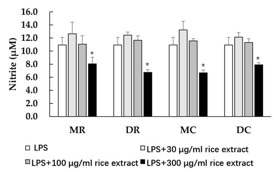 The effects of purple rice extracts on lipopolysaccharide (LPS)-induced nitric oxide production. Accordingly, *: significantly different than the negative control, p < 0.05. MR: methanol extract of raw rice, MC: methanol extract of cooked rice, DR: dichloromethane extract of raw rice, and DC: dichloromethane extract of cooked rice.