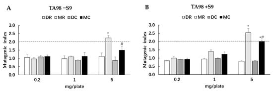 Mutagenicity of various extracts of glutinous purple rice in S. typhimurium strain TA98 under the following conditions: (A) an absence of S9 (TA98−S9), and (B) the presence of S9 (TA98 +S9). MR: methanol extract of raw rice, MC: methanol extract of cooked rice, DR: dichloromethane extract of raw rice, DC: dichloromethane extract of cooked rice. *: significantly different than the control (mutagenic index is 1.0), p < 0.05; #: significantly different than MR.