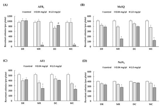 Antimutagenicity of various extracts of glutinous purple rice in S. typhimurium strains TA98 and TA100 against mutagenesis induced by: (A) AFB1 (TA98), (B) MeIQ (TA100), (C) AF-2 (TA98), and (D) NaN3 (TA100). MR: methanol extract of raw rice, MC: methanol extract of cooked rice, DR: dichloromethane extract of raw rice, and DC: dichloromethane extract of cooked rice. *: significantly different than the control, p < 0.05. #: significantly different than DR, p < 0.05.