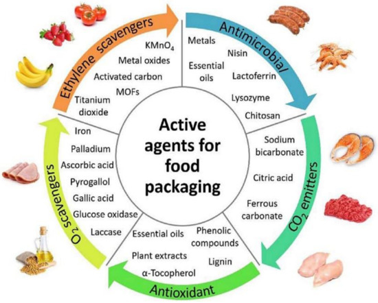Active packaging can be created by implementing antimicrobial agents into the packaging composition [1]. The use of antimicrobial agents in packaging can create an environment within the food packaging that can delay or prevent the growth of microorganisms on the food product. This, in turn, increases the shelf life and safety of the food product [12]. Figure 1 concisely highlights the typical active agents used commercially in food packaging that are characterized as antimicrobial agents, antioxidant agents, oxygen scavengers, ethylene scavengers, and carbon dioxide emitters, and examples of each are given [13]. In more recent years, attention has turned to a more ‘natural’ approach to active packaging, as opposed to the current practice of using active packaging materials that may contain modified gases, dyes, and inorganic compounds. EOs, organic acids, enzymes, biopolymers, antimicrobial peptides, and organic acids are all antimicrobial agents [12,14]. Antioxidant packaging prevents unsuitable oxidation and aerobic microorganism growth. This type of packaging reduces the metabolism of the food product [11]. O2 absorbers lower the oxygen concentration to less than 0.01 percent, reducing O2 diffusion in food packaging [15]. O2 absorbers are made up of chemical substances, including iron, ascorbic acid, or enzymes, that can react with oxygen and absorb up to 2000 cc of O2 from 10,000 ccs of air [16]. Ethylene is a growth hormone that fruits and vegetables produce during storage. Ethylene increases food respiration, lowering the shelf life of food products.
