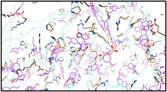 View of the EO-impregnated biofilm in greater detail, showing the side chains of the amino acids that interact with the EO molecules (colour purple). Sticks are used to symbolize the side chains of amino acids, while the wire is used to represent EO compounds. Hydrogen bonds are represented by the green lines. Atoms are represented by colour; for example, oxygen is red, and nitrogen is blue (Adopted from Cruz et al. [33]).