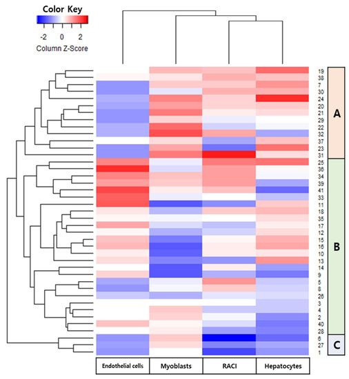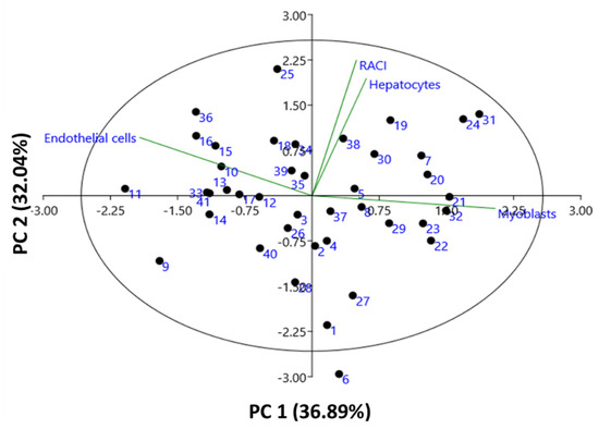 Hierarchical clustering analysis (HCA) is a multivariate analytical tool used to cluster samples based on dissimilar characteristics and is displayed as a dendrogram. The 41 wheat cultivars were classified into three clusters according to their antioxidant and cytoprotective activities (Figure 3 and Table 5). Group A contained 13 cultivars and had the highest RACI and cytoprotective activities in hepatocytes and myoblast. Group B contained 25 cultivars and had the highest cytoprotective activities in the endothelial cells. Group C contained three cultivars and had the relatively lowest antioxidant and cytoprotective activities in the hepatocytes and endothelial cells.
