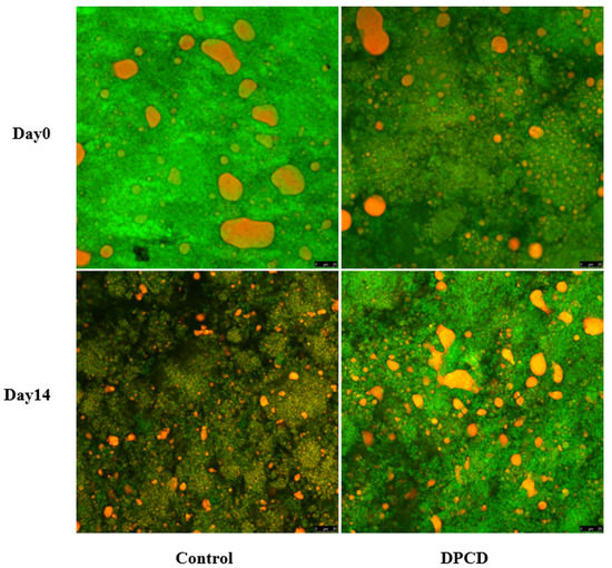 The microstructure of cheese samples was monitored using CSLM to determine the changes in the protein matrix (stained in green) and fat distributions (stained in red). It could be observed that a relatively continuous protein matrix existed in the control initially, accompanied, however, by slight heterogeneity and a dispersed fat phase in the form of discrete and large globules (Figure 1). This could be explained by the milk used for the cheese preparation not being homogenized, which probably resulted in an increase in particles and a lack of active fillers (homogenized milk fat globules) in the acidified casein network [25]. At day 0, an ununiform and loose microstructure of cheese resulted from DPCD treatment distinguishably, since many black cracks appeared in the protein matrix. This was due to the fact that DPCD treatment could lead to aggregation of milk proteins in cheese by enhancing the protein–protein interactions [11,19]. The transition from its protein hydration to protein–protein interactions then resulted in a more discontinuous protein matrix [26]. Additionally, this supported our sensory descriptions stating that DPCD-processed cheese had a slightly gritty flavor. After the storage for 14 days, we found an obvious extension of the serum phase and a concomitant reduction in the size of, and an increase in the number of, fat globules in the control. Similar microstructural changes have also been described in cheese subjected to high-pressure treatment [27]. However, there was no distinguishable change in the microstructure of DPCD-processed cheese. Combined with proteolytic analysis, the intense proteolysis might lead to a weakening of the connection between casein as well as a loosening of the protein skeleton structure, which could explain the greater extension of the serum phase in the control.