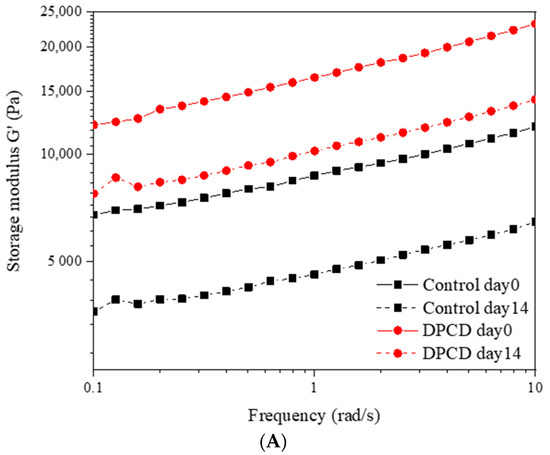 Processing with DPCD and the storage times affected the rheological performance of cheese samples, as displayed in Figure 2. The storage modulus (G′) reflects the ability of cheese to store energy while maintaining its complete structure and loss modulus (G″) indicating the ability to dissipate mechanical energy by converting mechanical energy into heat through molecular motion [28]. For all cheeses, we found that G′ > G″, demonstrating the elastic structure of our quark cheeses (Figure 2A,B). This was consistent with the strain sweep test results for Akawi cheese reported by Abdalla et al. [29]. The viscoelastic properties (G′ and G″) of cheese were obviously enhanced by DPCD treatment. However, these values were diminished during storage for both cheeses. Power law rheological parameters (k′, n′, k′, n″) were calculated and are shown in Table S1 to further characterize the viscoelastic properties of cheese. The values of n′ and n″ reflected the frequency dependence of rheological parameters and were used to describe the type of bonding of the structural elements present in the matrix [30]. These values for all cheese samples were always lower than 0.20, which is considered a relatively low level, indicating the presence of strong and cross-linked gels with permanent covalent bonds [30]. We found a significant increase in n′ value following DPCD treatment on day 0, indicating an increase in the frequency dependence of rheological moduli. This suggested a less structured cheese matrix resulted from DPCD processing. As we previously discussed, this was consistent with the more discontinuous protein phase and extended serum phase of cheese after DPCD treatment.