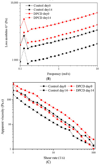 Shear properties of cheese should be estimated in the complete characterization of rheological profiles. The change in apparent viscosity with shear rate is exhibited in Figure 2C. It could be observed that the apparent viscosity of cheese decreased continuously with increasing shear rate, indicating the shear thinning flow behavior. The flow behavior index (n) and the consistency index (k) were also calculated through the power law model and displayed in Table S1. Similarly to the viscoelastic results, the cheese processed with DPCD showed lower n values than the control at day 0. This demonstrated the weakened ability to resist shearing led by DPCD because of the discontinuous protein network structure. However, DPCD significantly increased the apparent viscosity of cheese at day 0 according to Figure 2C and k value changes in Table S1. Changes in moisture distribution, which has been confirmed to be closely related to the rheological properties of cheese, were most likely to blame [30]. The prolonging of storage time caused an obvious decrease in apparent viscosity, which corresponded to alterations in k′ and k″ values. The proteolysis might be responsible for this phenomenon. Surprisingly, DPCD-processed cheese after 14 days of storage displayed similar rheological properties to the control at day 0. So, DPCD treatment could somewhat compensate for the degradation of cheese’s rheological properties during storage.