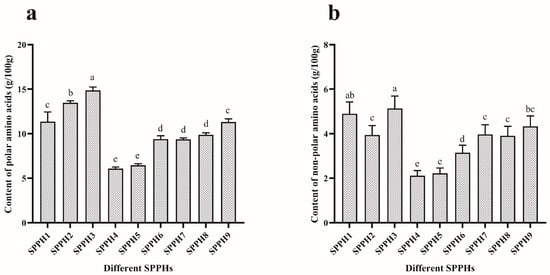 Amino acid content of SPPHs. (a) The content of polar amino acids in SPPHs. (b) The content of non-polar amino acids in SPPHs. All the data were analyzed by Duncan’s multiple comparisons; bars with no letter in common are significantly different at the level of p < 0.05.